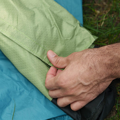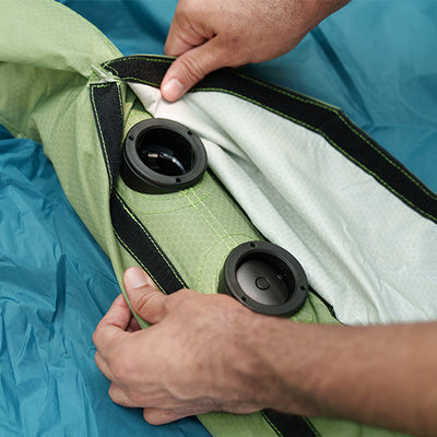 CloudCamp™ is constructed with a durable 210D polyester shell coated with PU2000MM waterproofing and UPF 50+ protection. The inflatable frame is made from high-strength TPU. It also includes mesh ventilation panels, reinforced zippers, and canopy rods. The tent inflates itself without any poles for the tent frame. The canopy rods are a bonus accessory used only to support the optional front awning.